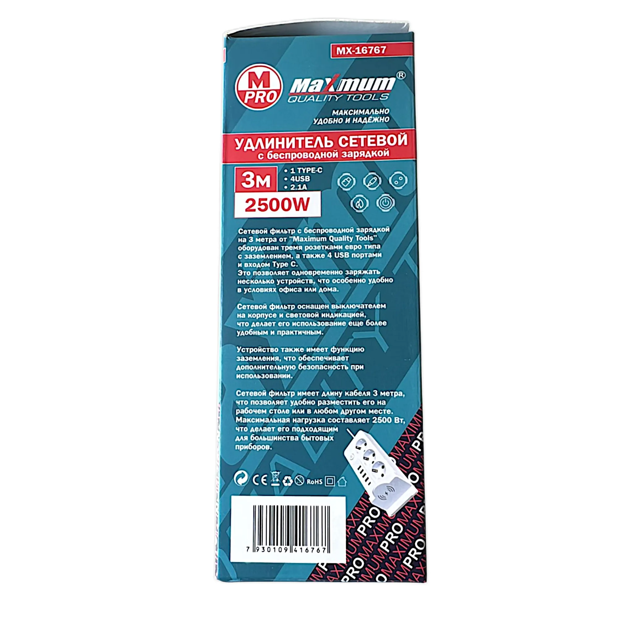 Белый сетевой фильтр с беспроводной зарядкой на 3 метра от "Maximum Quality Tools" оборудован тремя розетками евро типа с заземлением, а также 4 USB портами и входом Type C.